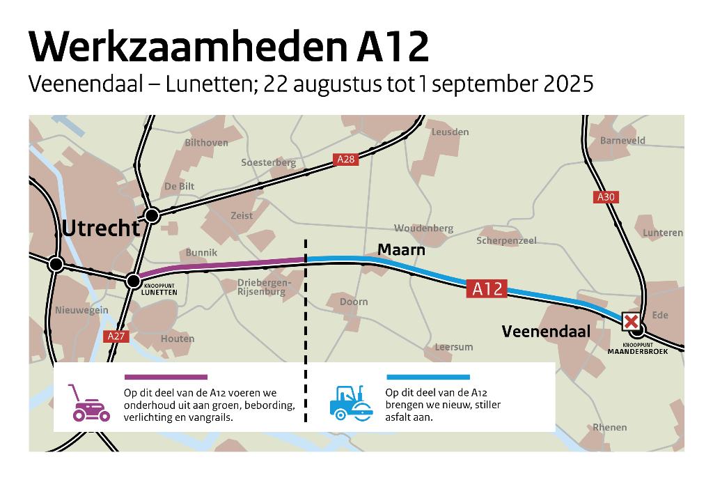 Van 22 augustus tot en met 1 september voert Rijkswaterstaat groot onderhoud uit aan de A12 tussen Veenendaal en Utrecht. De snelweg is dan afgesloten richting Utrecht. Houd rekening met omleidingsroutes en extra reistijd.