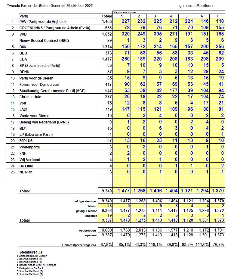 Op 29 oktober 2025 waren de Tweede Kamer verkiezingen. De voorlopige uitslag van de verkiezingen in Montfoort zijn bekend.