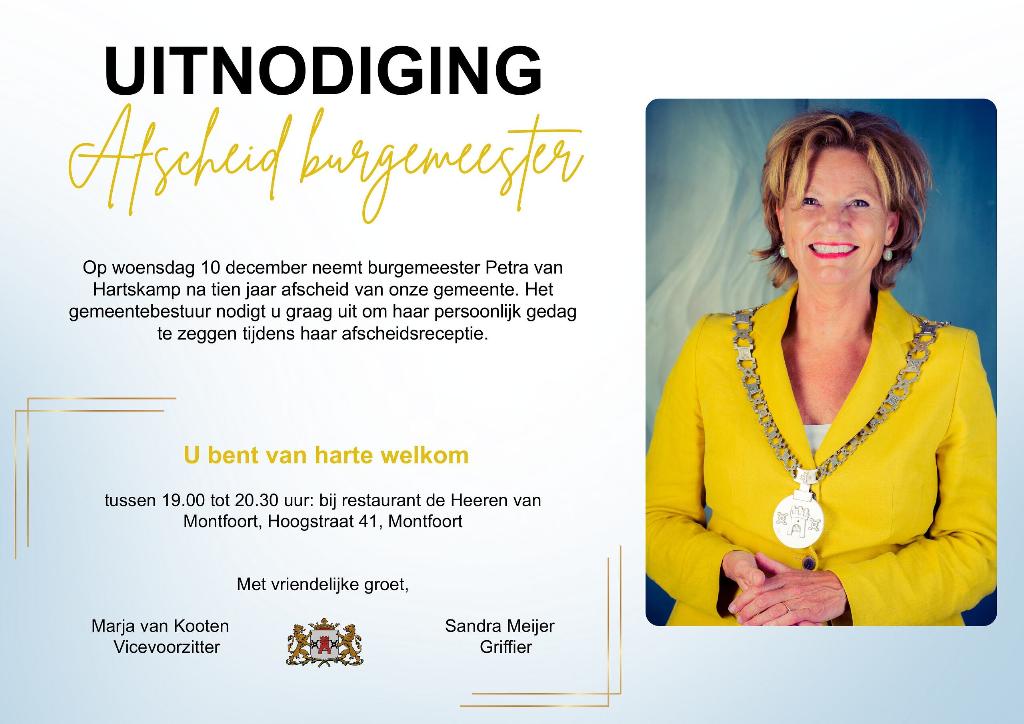 Meer berichten in deze categorie:Techniek Doe Dag Woerden 17 april (10-04-2026) Resultaten Veiligheidsmonitor 2025 (10-04-2026) Extra informatieavond over windenergie in Cattenbroek (08-04-2026) Installatie nieuwe gemeenteraad 2026 - 2030 (02-04-2026) Definitieve uitslag Gemeenteraadsverkiezingen (31-03-2026) Gemeente breidt laadnetwerk uit met 16 datagestuurde laadpalen (27-03-2026) Ontmoet de nieuwe gebiedsmanager: Els de With (20-03-2026) Subsidieaanvraag en vaststelling (20-03-2026) Voorlopige uitslag Gemeenteraadsverkiezing (19-03-2026) Raadsvergadering 1 april 2026 (18-03-2026) Raadsvergadering 31 maart 2026 (18-03-2026) Verkiezingsuitslagenavond gemeenteraadsverkiezingen (18-03-2026) Gemeenteraad werkt mee aan versneld verplaatsen van Ruvoma (17-03-2026) Samenwerken aan betaalbaar en prettig wonen in Montfoort en Linschoten (17-03-2026) Werkzaamheden aansluiting Julianalaan Willeskopperpoort (13-03-2026) Bouwverkeer voorbelasten De Bleek fase 1 (13-03-2026) College kijkt met een goed gevoel terug op bestuursperiode (13-03-2026) Windenergie Cattenbroek: twee momenten om in gesprek te gaan (10-03-2026) UF-schuim en woningisolatie (09-03-2026) VVD Montfoort lanceert omgekeerde kieswijzer: de VVD Check Voor Montfoort (09-03-2026) Gemeente Montfoort sluit samenwerkingsovereenkomst met het Jeugdteam Montfoort (06-03-2026) Groene Hart Pas en OV-korting (05-03-2026) Hondenlosloopgebied Stadspark klaar (05-03-2026) Vreemd of verdacht? (05-03-2026)
