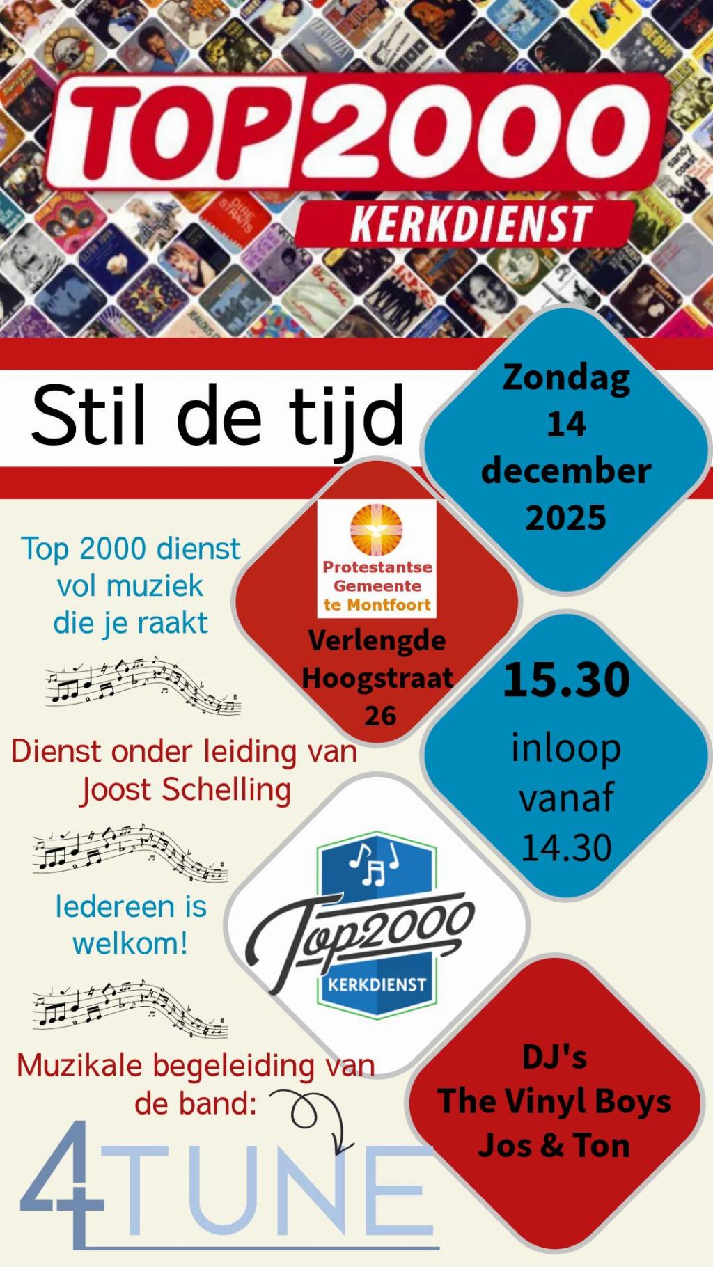 Geplaatst op:11-12-2025 Bijgewerkt op:12-12-2025 08:55 Bijzondere Top2000-kerkdienstBron: Peter VerslootBijzondere Top2000-kerkdienst op 14 december in Montfoort Op zondag 14 december aanstaande om 15.30 uur vindt er een Top2000-kerkdienst plaats in de Rank in Montfoort. Vanaf 14.30 is de kerk open. Deze kerkdienst haakt aan bij de traditionele Top 2000 van NPO Radio 2. Het is alweer de 8e keer dat dit in de Rank wordt georganiseerd. Nummers met inhoud In de Top2000 staan veel nummers met inhoud: nummers die emoties teweeg brengen, kippenvel geven en herinneringen oproepen. Sommige nummers gaan expliciet over geloof of God, zoals ‘What if God was one of us’, van Joan Osborne. Andere blijken bij nadere beschouwing te gaan over belangrijke levenservaringen als liefde, dood en troost. Ds. Joost Schelling gaat voor in deze kerkdienst. Schelling “Wat is er dan mooier dan in een kerkdienst samen te luisteren naar de mooiste betekenisvolle nummers uit de popgeschiedenis? En die dan ook nog door de bekende band 4Tune (zie foto) worden gespeeld. 4 Tune is een allround coverband uit Hardinxveld-Giessendam die in 2014 meedeed met het TV programma Zing ! In de kerk zijn ook DJ’s Jos en Ton aanwezig, die voor en na de dienst verzoeknummers draaien. Gaaf is ook, dat een aantal mensen een persoonlijk verhaal vertelt bij een nummer. ”