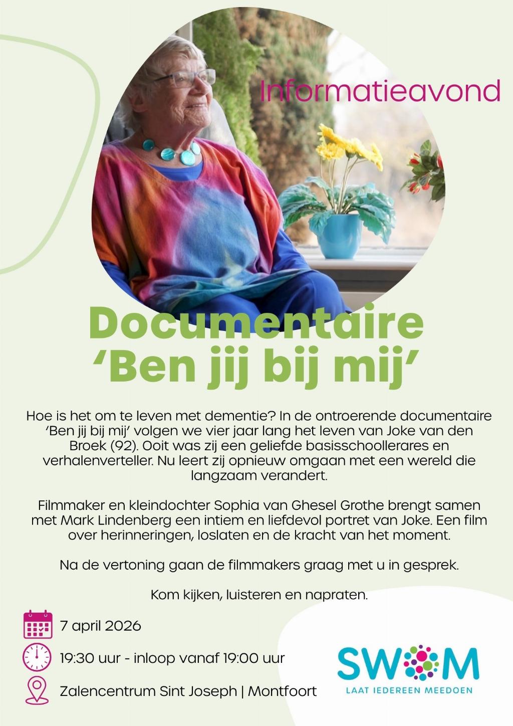 Geplaatst op:17-03-2026 Bijgewerkt op:17-03-2026 12:33 Documentaire ‘Ben jij bij Mij’ te zien tijdens filmavond in MontfoortBron: Persbericht SWOMDocumentaire ‘Ben jij bij Mij’ te zien tijdens filmavond in Montfoort Montfoort – Ontmoetingscentrum ’t Bakkershuis en Steunpunt Mantelzorg organiseren op dinsdag 7 april een filmavond in Zalencentrum Sint Joseph in Montfoort. Tijdens deze avond wordt de documentaire Ben jij bij Mij vertoond, een film over leven met dementie. Na afloop is er gelegenheid om met de filmmakers en bezoekers in gesprek te gaan. De documentaire portretteert Joke van den Broek, de 92-jarige oma van filmmaker Sophia van Ghesel Grothe. Joke werkte vroeger als lerares op een basisschool en stond bekend als een echte verhalenverteller die overal een lichtpuntje in wist te zien. Gedurende vier jaar volgen de makers haar leven en laten zij zien hoe zij omgaat met dementie. Wanneer Joke wordt geconfronteerd met het verlies van haar vertrouwde verhaal en omgeving, moet zij zichzelf opnieuw ontdekken. Toch blijft zij, ondanks deze ingrijpende veranderingen, even wijs als altijd. Daarmee laat zij op een liefdevolle manier zien hoe het proces van ouder worden met dementie ook geaccepteerd kan worden. De documentaire is gemaakt door Sophia van Ghesel Grothe, tevens de kleindochter van Joke, en filmmaker Mark Lindenberg. Na afloop van de vertoning is er daarom gelegenheid om met Sophia en Mark in gesprek te gaan over de film en de thema’s die daarin naar voren komen. De filmavond begint om 19.30 uur in Zalencentrum Sint Joseph. Je bent vanaf 19.00 uur welkom om binnen te lopen. De toegang is gratis. Na afloop van de film is er bovendien gelegenheid om nog even na te praten. Ben je benieuwd naar deze bijzondere documentaire? Dan ben je van harte welkom tijdens deze filmavond in Montfoort.